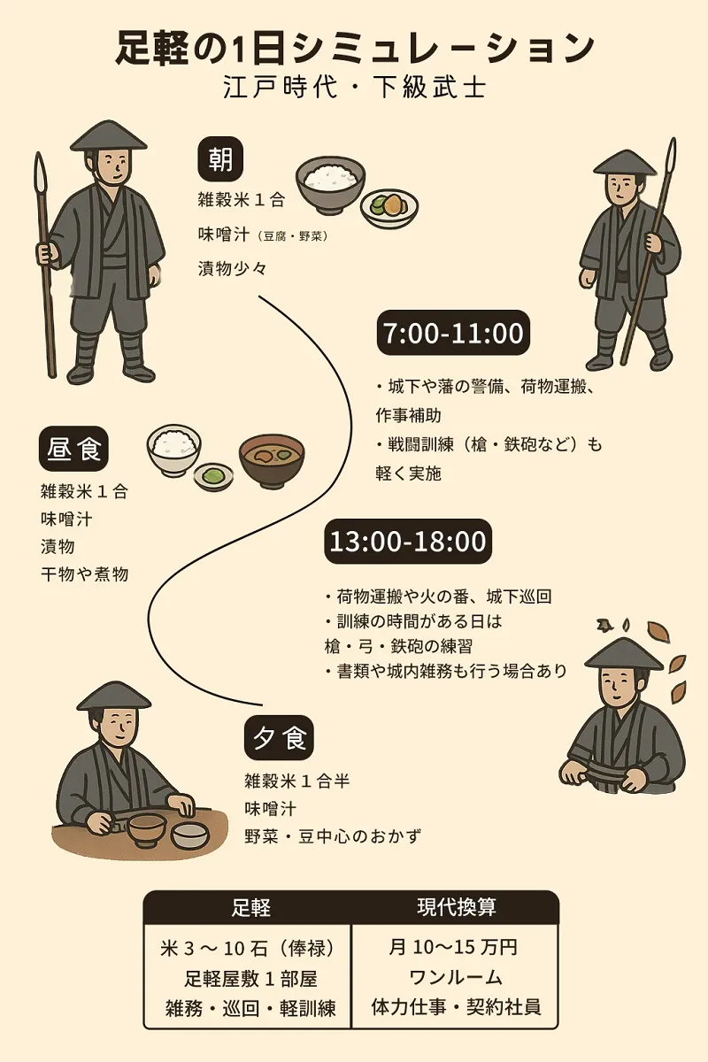 足軽の1日の食事量は、成人男性で米に換算しておよそ2合(約300g)前後と推定されています。